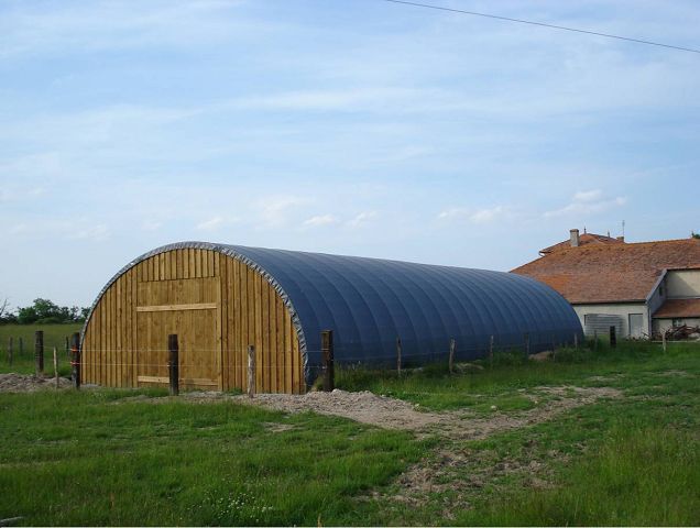 Options : Isolation en laine de verre de 80 à 160mm, ventilation par fenêtre et cheminée, bardage intérieur en tôle, pignon d'extrémité avec portes et portail.